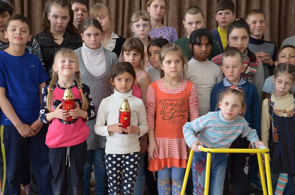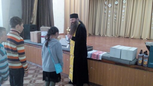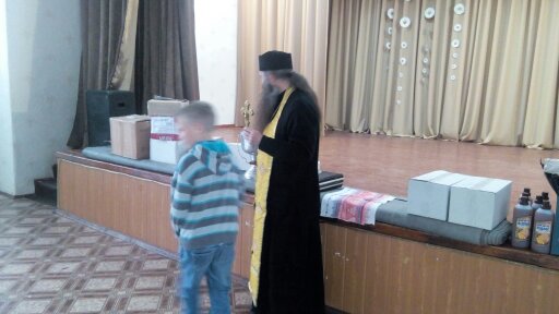 Так миссия побывала и в школе-интернате для детей с инвалидностью (82 ребенка с ДЦП и болезнью Дауна) г. Кременная (Луганская обл.), которому уже более двух лет помогает община храма "Всех святых воинов". Но не только Благодатный огонь и пасхальные куличи получили в праздничные дни дети. Гуманитарный груз включал в себя и все необходимое для развивающих занятий с детками-инвалидами. На фото: воспитанники интерната с Благодатным огнем, руководитель миссии в Луганской области прот. Игорь Савченко по окончании молебна благословляет детей.
