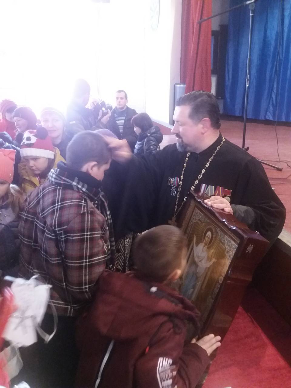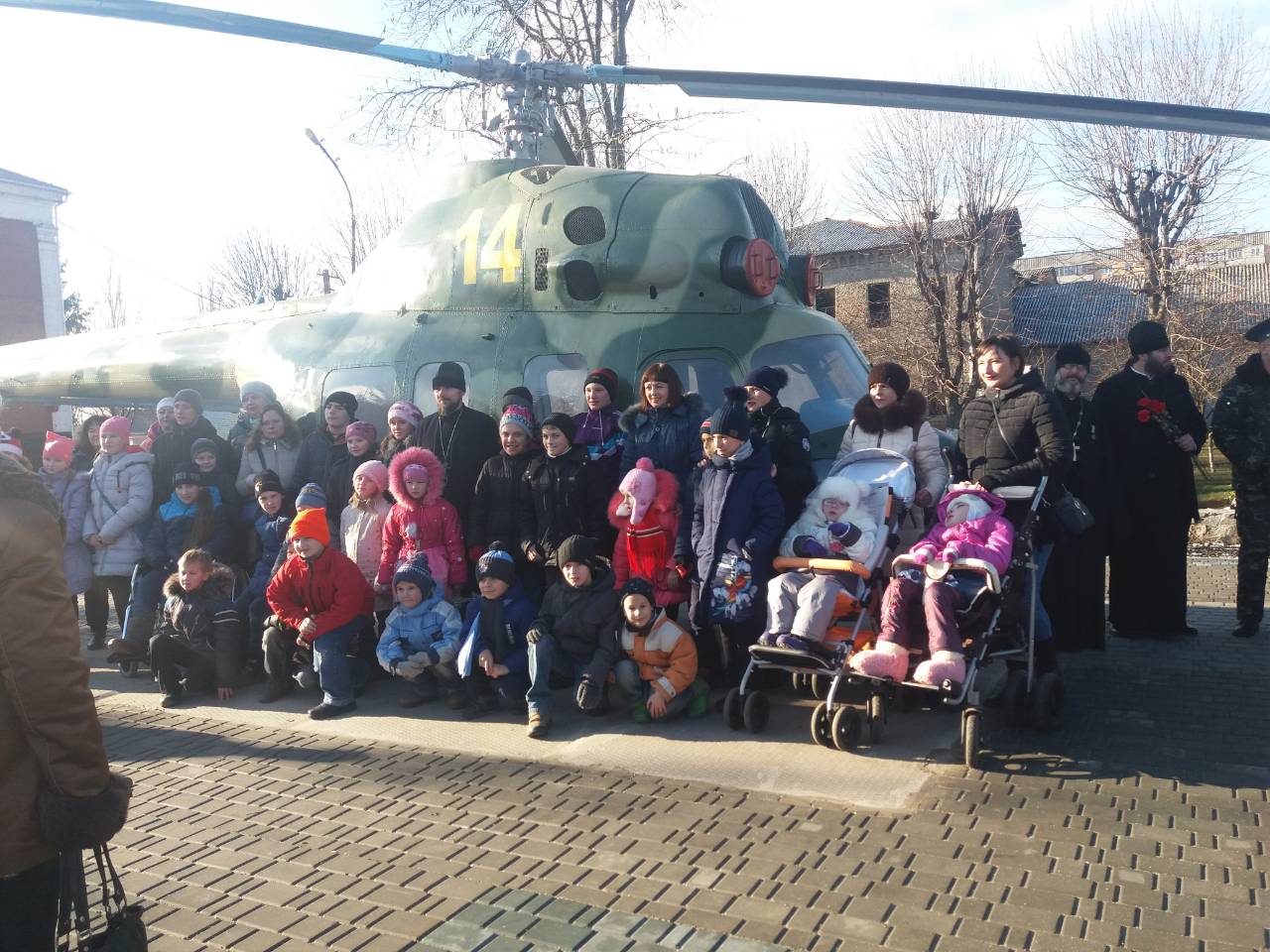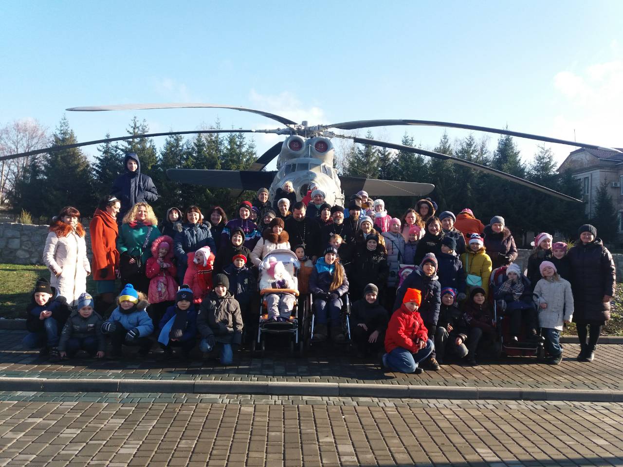24 ноября в воинской части Национальной Гвардии Украины, расположенной в Александрии (Кировоградская обл.) состоялся праздник, в котором приняли участие не только военнослужащие, но и дети-инвалиды. Сначала вместе с правящим архиереем епархии епископом Александрийский и Светлогорским Боголепом все помолились и возложили цветы у памятника погибшим защитникам Отечества, которые служили в части, а затем состоялась экскурсия во время которой дети побывали в вертолете. После вкусного настоящего солдатского обеда детей ждал концерт с участием, приглашенных владыкой Боголепом, почетных гостей из Киева: певицы и волонтера, лауреата Свято-Георгиевского международного фестиваля культуры и творчества Дарины Коломыцкой, члена оргкомитета Свято-Георгиевского фестиваля, режисера и ведущей праздника Татьяны Коломыцкой и духовника Фестиваля прот. Вячеслава Яковенко. Все зрители и участники мероприятия смогли получить не только душевную радость, но и духовную пользу: о. Вячеслав привез с собой икону Покрова Пресвятой Богородицы с частицей Ее омофора, с которой, по благословению Предстоятеля УПЦ Блаженнейшего митрополита Онуфрия, многократно совершались миротворческие духовные миссии по зоне боевых действий. В конце праздника, по предложению о. Вячеслава, все детки решили стать защитниками Отечества - теперь они каждый день будут молиться о мире в Украине. После того как Преосвященнейший владыка Боголеп благословил всех иконой Богородицы все смогли помолиться и приложиться к святому образу Покрова.