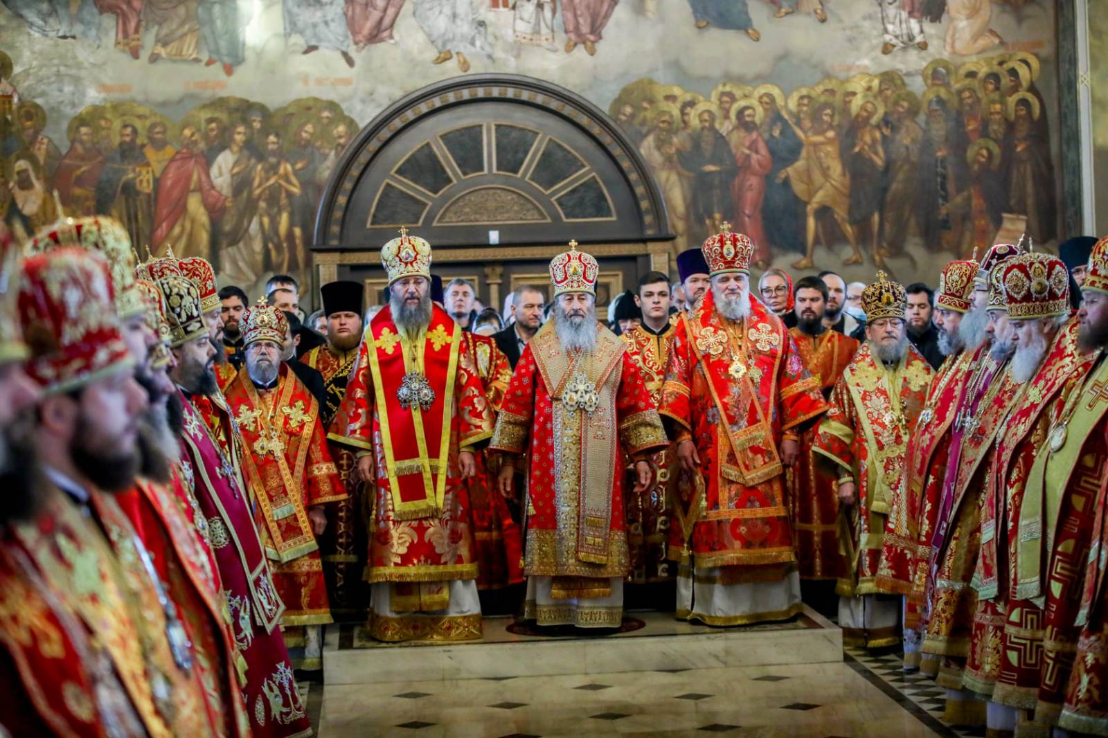 Предстоятелю співслужили керуючий справами УПЦ митрополит Бориспільський і Броварський Антоній, митрополити: Овруцький і Коростенський Віссаріон, Білоцерківський і Богуславський Августин, Поліський і Сарненський Анатолій, Івано-Франківський і Коломийський Серафим, Херсонський і Таврійський Іоанн, Полтавський і Миргородський Филип, Запорізький і Мелітопольский Лука, Житомирський і Новоград-Волинський Никодим, Уманський і Звенигородський Пантелеімон, Сумський і Охтирський Євлогій, Кіровоградський і Новомиргородський Іоасаф, Сєверодонецький і Старобільський Никодим, Львівський і Галицький Філарет, Черкаський і Канівський Феодосій, Кременчуцький і Лубенський Миколай, Ніжинський і Прилуцький Климент, Вінницький і Барський Варсонофій; архієпископи: Бучанський Пантелеімон, Городницький Олександр, Бердянський і Приморський Єфрем, Олександрійський і Світловодський Боголєп, Васильківський Миколай; єпископи: Баришівський Віктор, Білогородський Сильвестр, Рівненський і Острозький Пимен, Переяслав-Хмельницький Діонісій, Згурівський Амвросій, Вишневський Спиридон, Любецький Никодим, Бишівський Кирил; духовенство собору, Бориспільської єпархії та гості у священному сані.